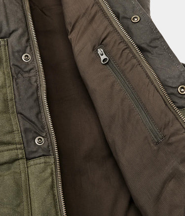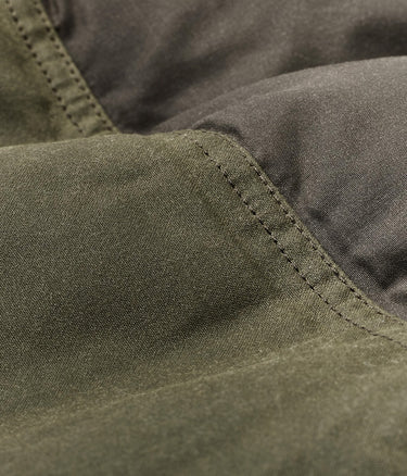 The shell of our down vest is made primarily with Cover Cloth, our lightest oil-finished waxed fabric, fully saturated with our special wax blend to ensure maximum water resistance.