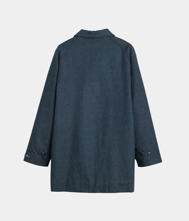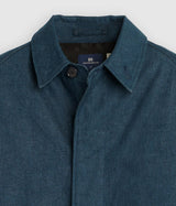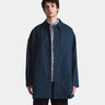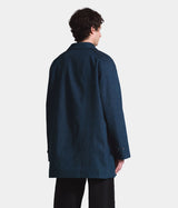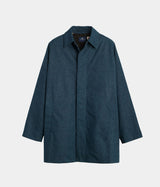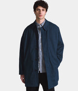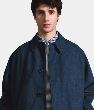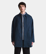 This Japanese denim Mac coat features a loose cut with a tailored look, a button front and a longer length.