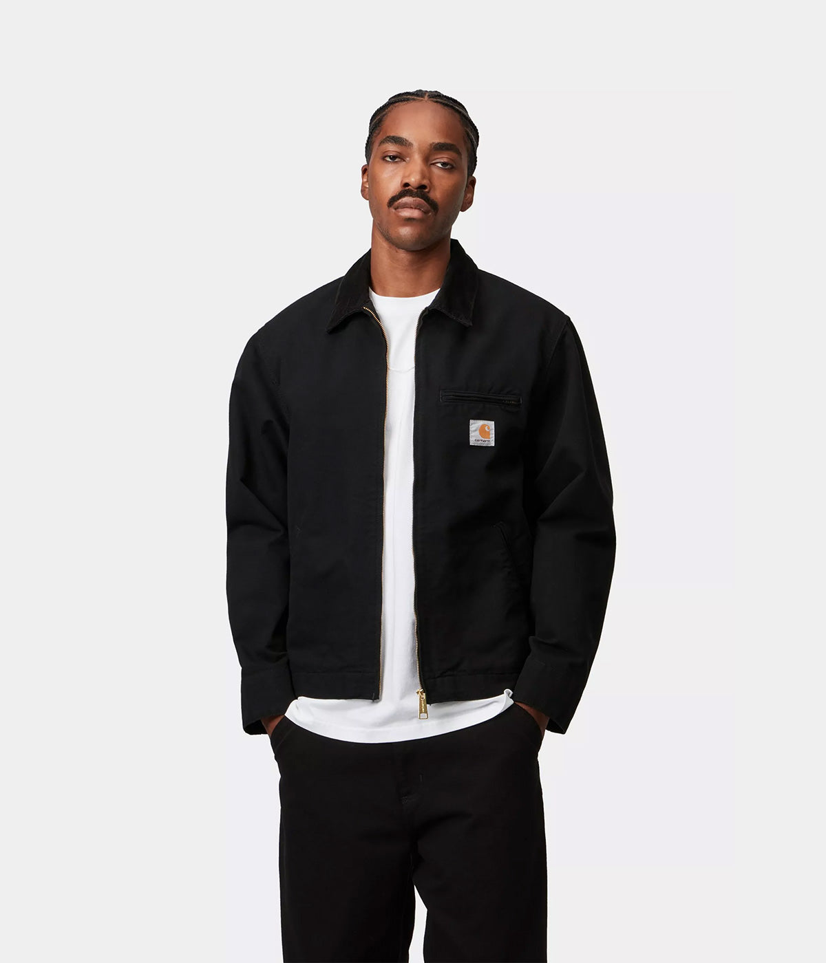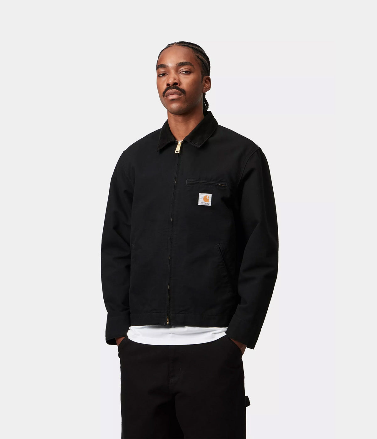 La Detroit Jacket è un modello non foderato realizzato in pesante tela Dearborn con colletto in velluto. La giacca è caratterizzata da chiusura anteriore con zip e polsini e orlo regolabili tramite bottoni automatici. Sul petto presenta un’etichetta quadrata in tessuto.