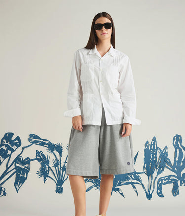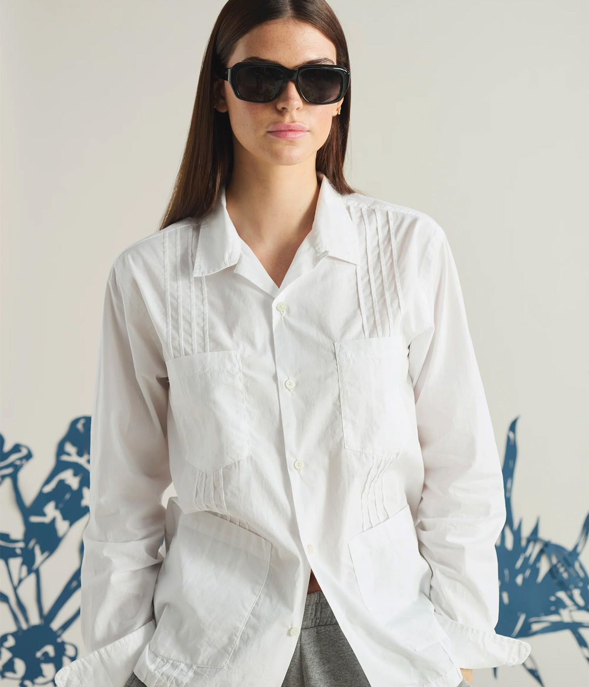 Ispirata allo stile vintage, la Dwight Overshirt è un modello con orlo dritto, file di pieghe cucite sul davanti su entrambi i lati e con l'aggiunta di 4 tasche applicate, perfetto per l'estate.