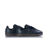토탈 블랙 프리미엄 가죽 갑피와 누벅 토 캡을 갖춘 새로운 아디다스 삼바 OG. 3개의 줄무늬에는 스터드가 있어 고급스러운 느낌과 로커 스타일을 연상시킵니다.